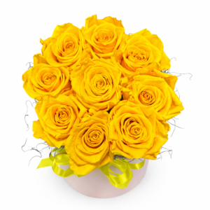 Elegantný box stabilizovaných žltých ruží 9 ks, ktoré si zachovávajú svoju krásu a farbu celé mesiace bez potreby polievania. Ideálny darček plný radosti, energie a optimizmu.