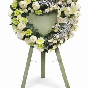 Elegantný umelý smútočný veniec v tvare srdca v jemných bielo-zelených tónoch. Vhodný na poslednú rozlúčku, s možnosťou doručenia priamo na obrad v Košiciach a okolí.