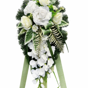 Elegantný smútočný umelý veniec v tvare slzy s bielymi ružami a bohatou zeleňou. Nadčasový a dôstojný doplnok na poslednú rozlúčku, vhodný do interiéru aj exteriéru.