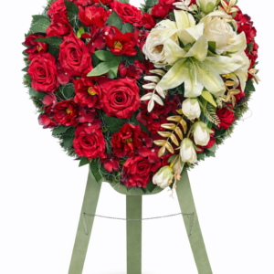 Elegantné umelé smútočné srdce v kombinácii červených a bielych kvetov je dôstojnou voľbou na poslednú rozlúčku. Symbolizuje lásku, úctu a spomienku na zosnulého. Vhodné na umiestnenie na stojan v obradnej sieni alebo na cintoríne. Doručenie Košice a okolie do 20 km.