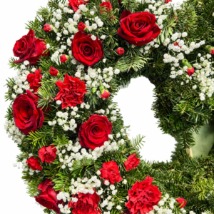 Živý smútočný veniec z červených a bielych ruží – symbol lásky a úcty. Smútočné vence s doručením priamo na pohrebné miesto. Objednajte smútočné vence v kvetinárstve Gerbera s 30-ročnou tradíciou-