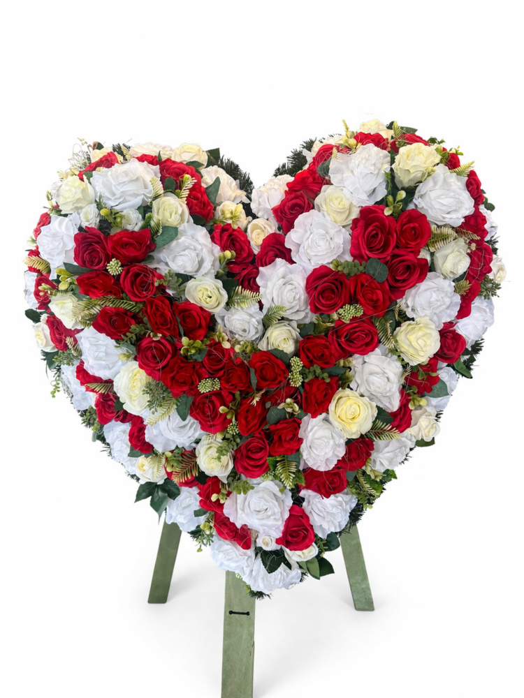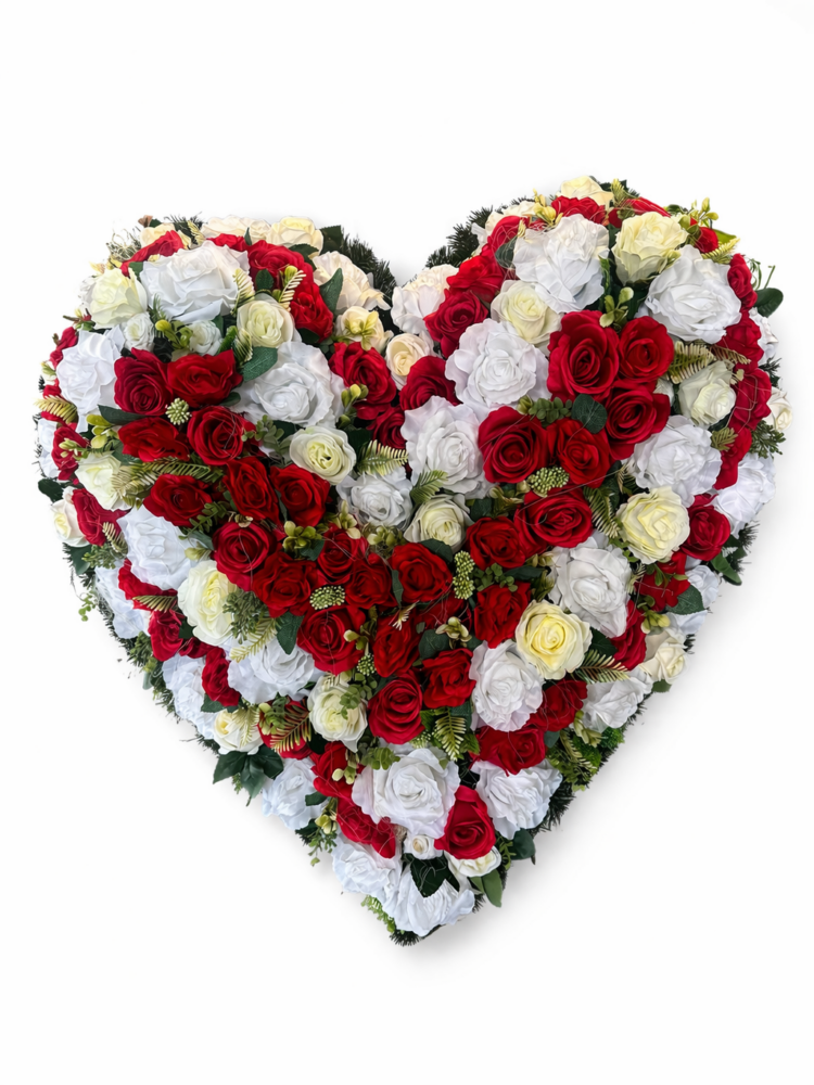 Elegantné smútočné srdce z umelých červeno-bielych ruží je symbolom lásky, úcty a spomienky. Vhodné na pohreb, do obradnej siene alebo na hrob. Doručenie Košice a okolie do 20 km.