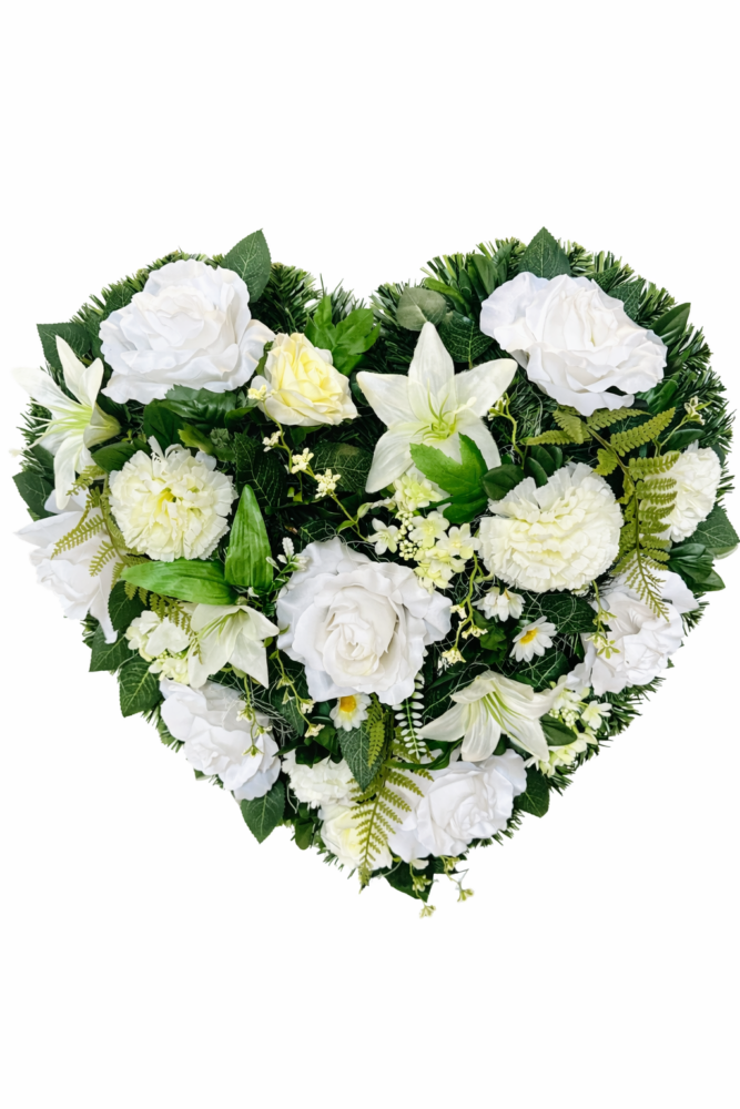 Umelé smútočné srdce v bielom prevedení je symbolom čistoty, pokoja a úprimnej spomienky na zosnulého. Jemná kombinácia bielych ruží, ľalií a doplnkových kvetov vytvára harmonický a dôstojný aranžmán vhodný na poslednú rozlúčku.