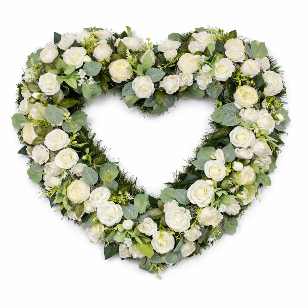Veniec Srdce je smútočna dekorácia vhodná na pomník, vyrobená z umelých materiálov.